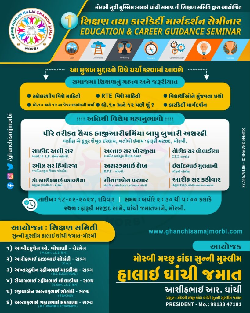 Date : 18/02/2024, First Education and Career Guidance Seminar was successfully organized by Education Committee of Morbi Sunni Muslim Halai Ghanchi Samaj at Ghanchi Jamatkhana, Morbi on Sunday.