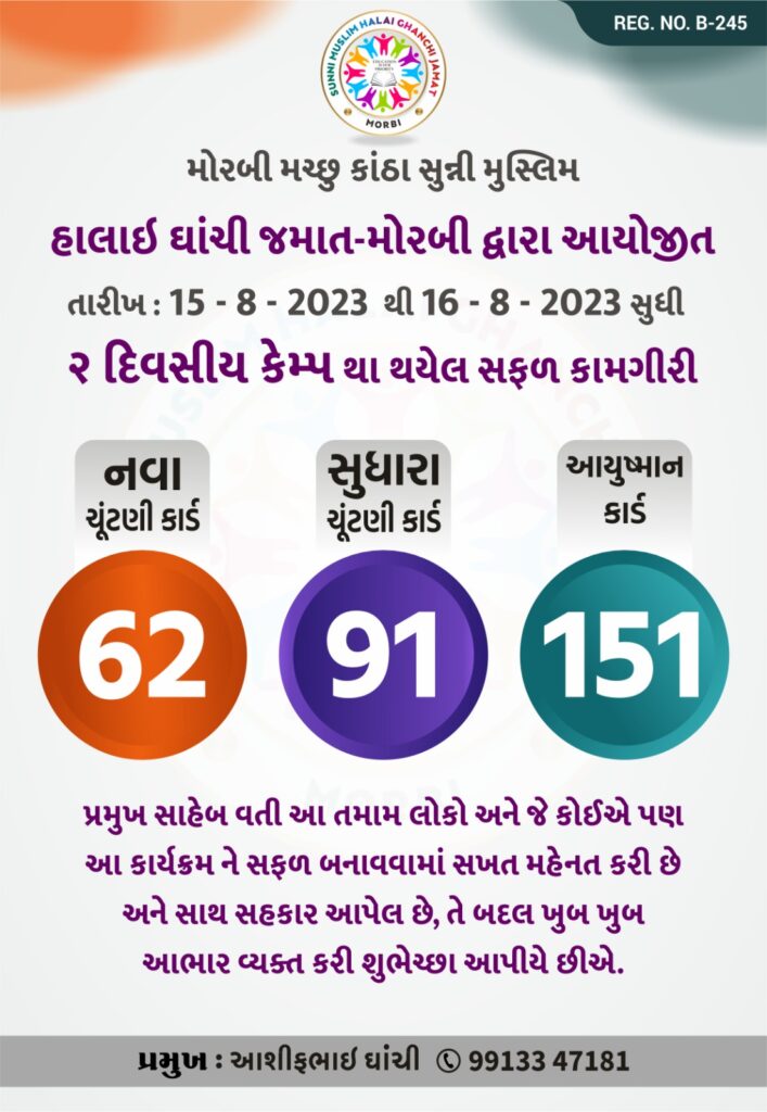 Thanks to all the members of Morbi Machhu Kantha Sunni Muslim Halai Ghanchi Jamaat.